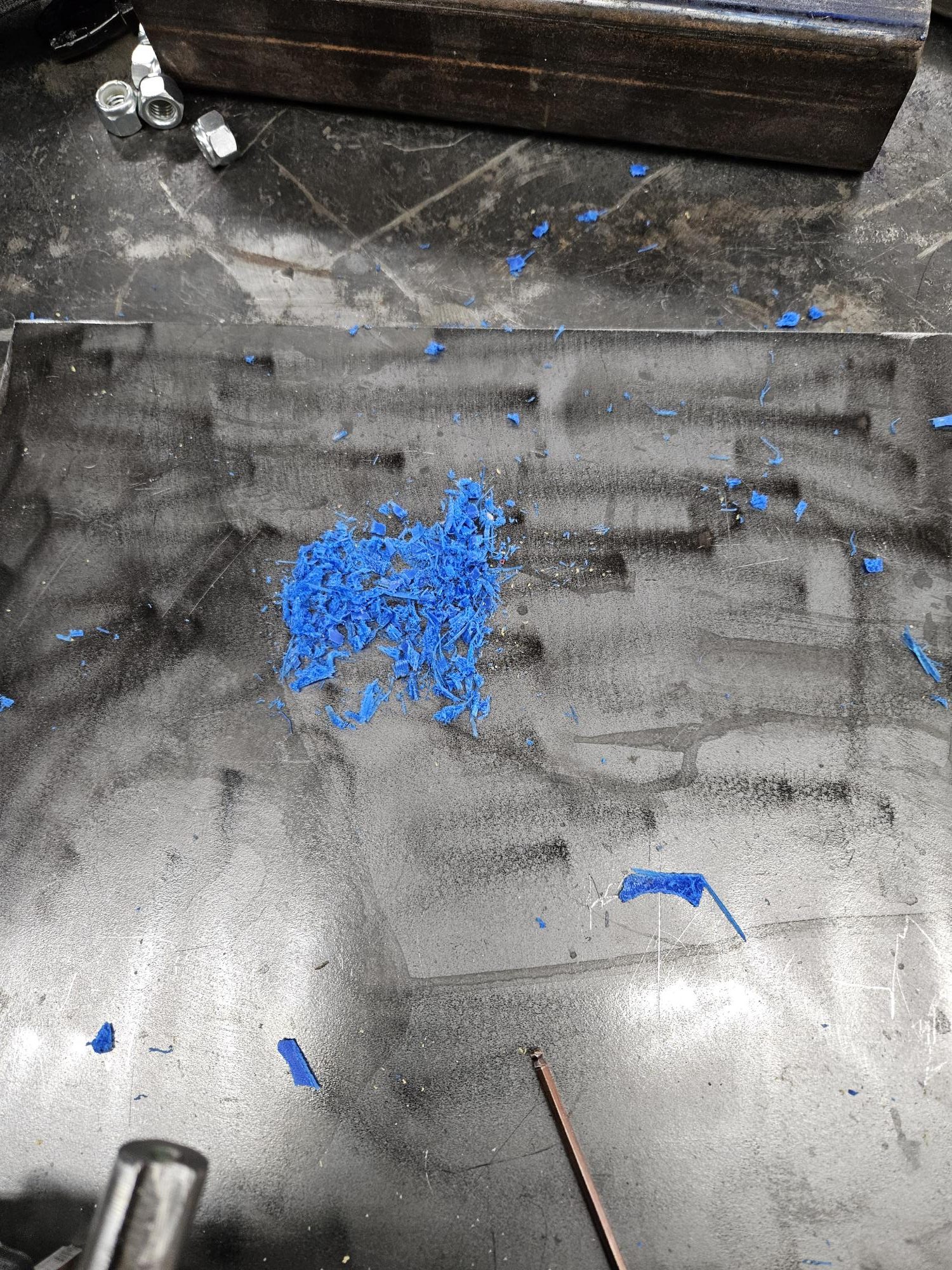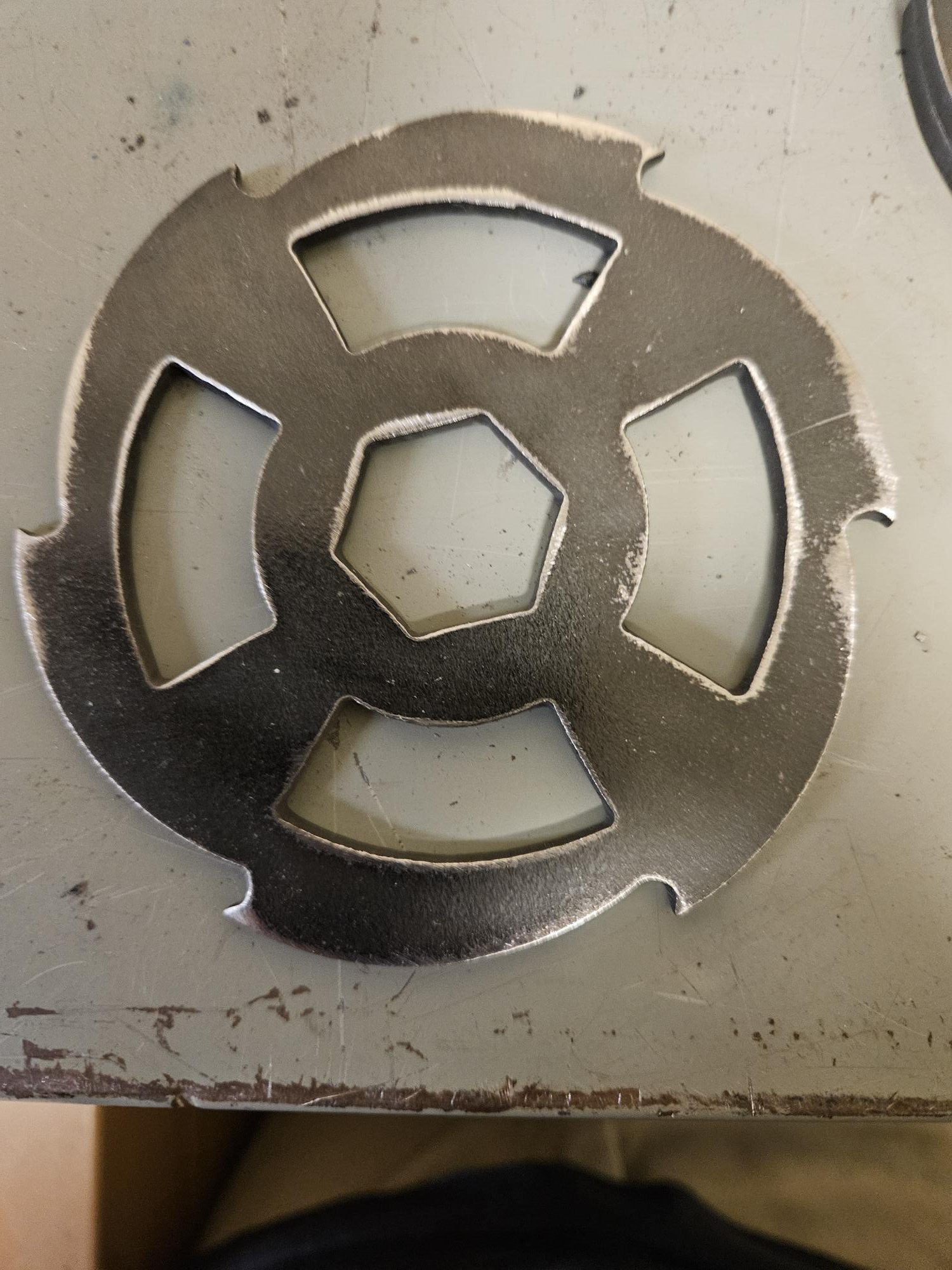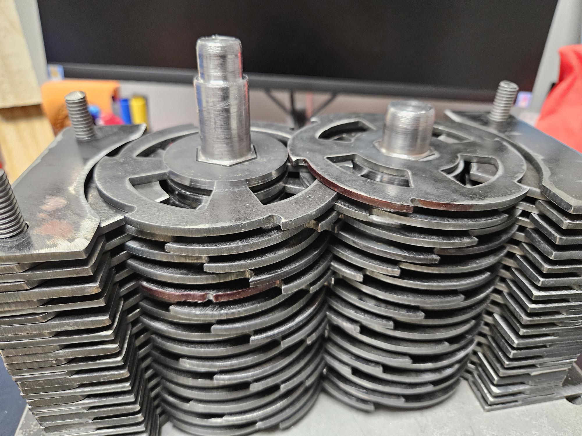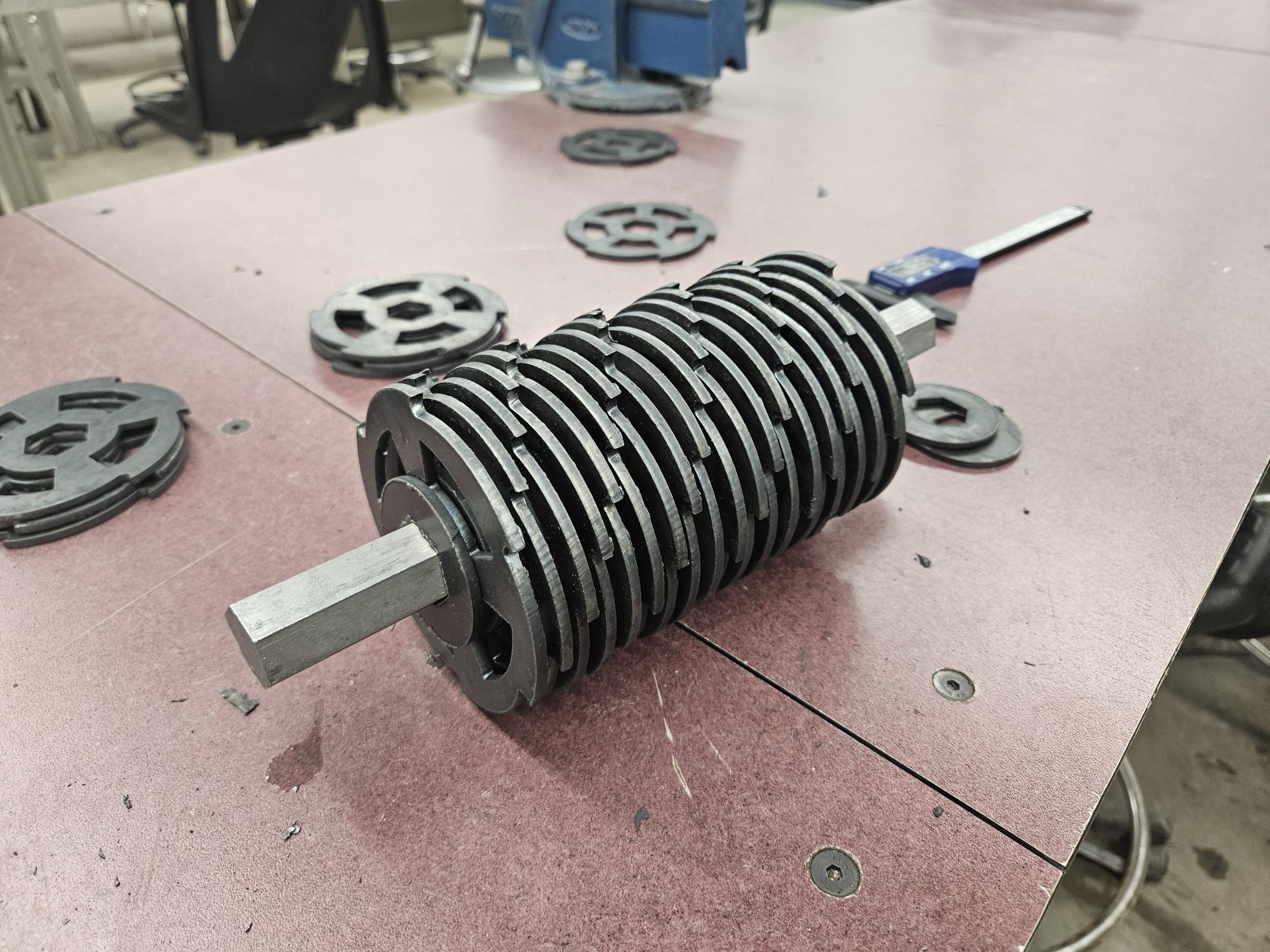 The majority of the machine was cut from 1/8â and 0.200â steel sheet metal using a CNC plasma cutter. The blades were separated by spacers and assembled on steel shafts and mounted onto bearings inside of an aluminum housing. The whole assembled was then welded down to a piece of steel sheet metal to prevent it from moving during the processing of material.